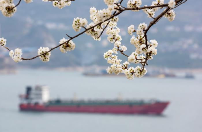 2月15日,轮船停泊在三峡大坝上游沙湾锚地。 近期,长江三峡两岸各色山花开放,春意渐浓。