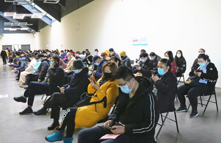 在高米店街道大兴区体育中心疫苗接种点,参与接种人员按照指示牌和工作人员引导,进行预约分诊、验证行程轨迹、验证北京健康宝、测量体温,完成后,分批次进入候诊区等待接种。