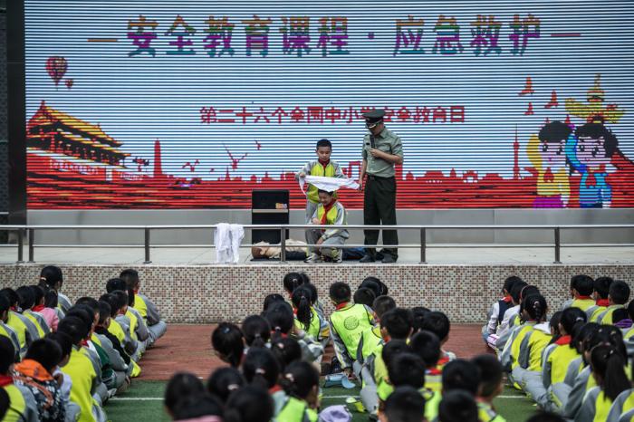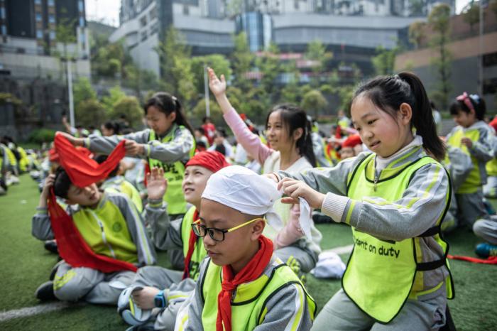 3月29日,芳草地国际学校贵阳分校的学生在学习三角巾包扎法。 当日是全国中小学生安全教育日,芳草地国际学校贵阳分校开展安全教育及社会实践活动,普及应急救护知识,增强学生们的安全意识。