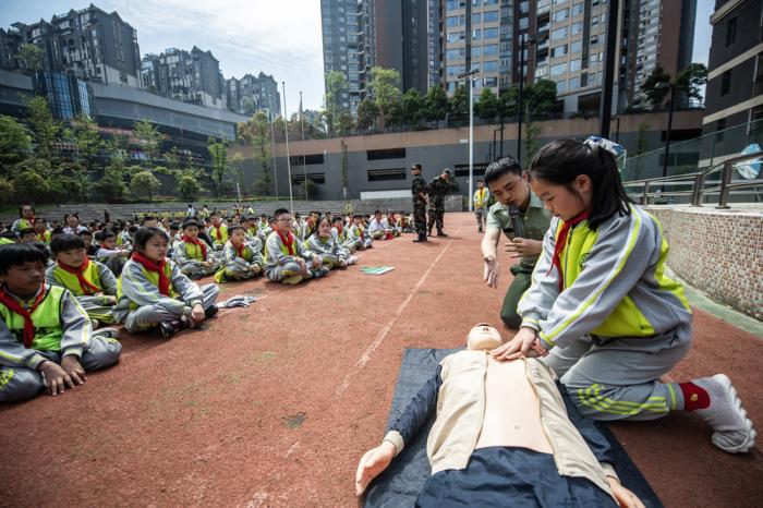 3月29日,芳草地国际学校贵阳分校的学生在学习心肺复苏救护操作。