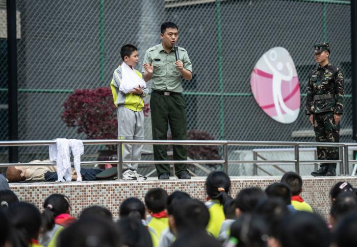 3月29日,授课教官在指导芳草地国际学校贵阳分校的学生学习三角巾包扎法。 摄影/新华社记者 陶亮