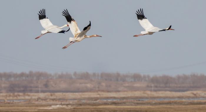 3月30日,在吉林省白城市镇赉县,三只白鹤从湿地上空飞过。