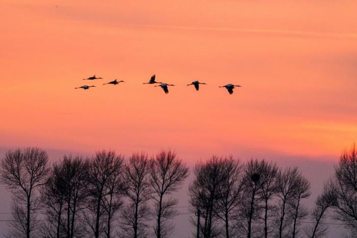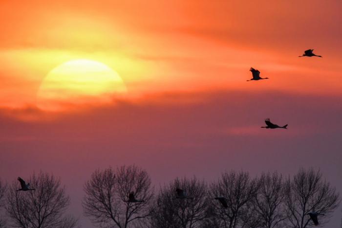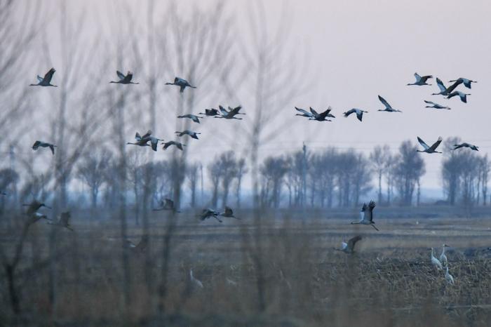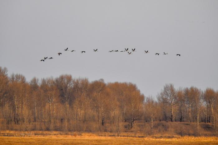 3月30日,在吉林省白城市镇赉县,众多候鸟从林间飞过。