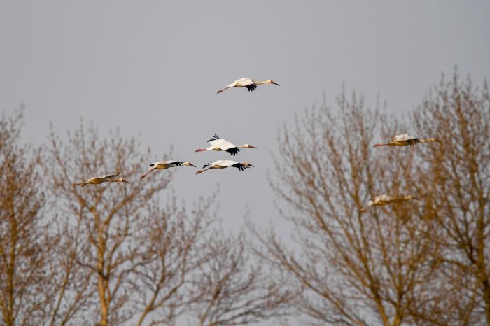 3月30日,在吉林省白城市镇赉县,几只白鹤从树林上空飞过。