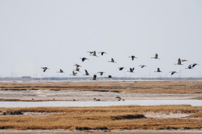 3月30日,在吉林省白城市镇赉县,众多候鸟在空中飞翔。随着气温转暖,众多候鸟飞抵吉林省白城市镇赉县境内停歇,补给觅食。镇赉县位于候鸟迁徙的重要通道上,湿地面积广阔,是候鸟迁徙途中的“驿站”。