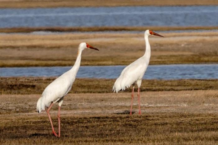 3月30日,在吉林省白城市镇赉县,两只白鹤在湿地栖息。