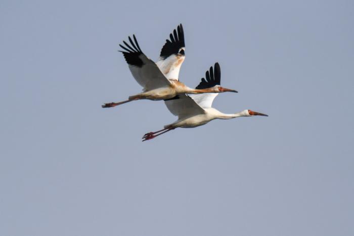3月30日,在吉林省白城市镇赉县,两只白鹤从湿地上空飞过。