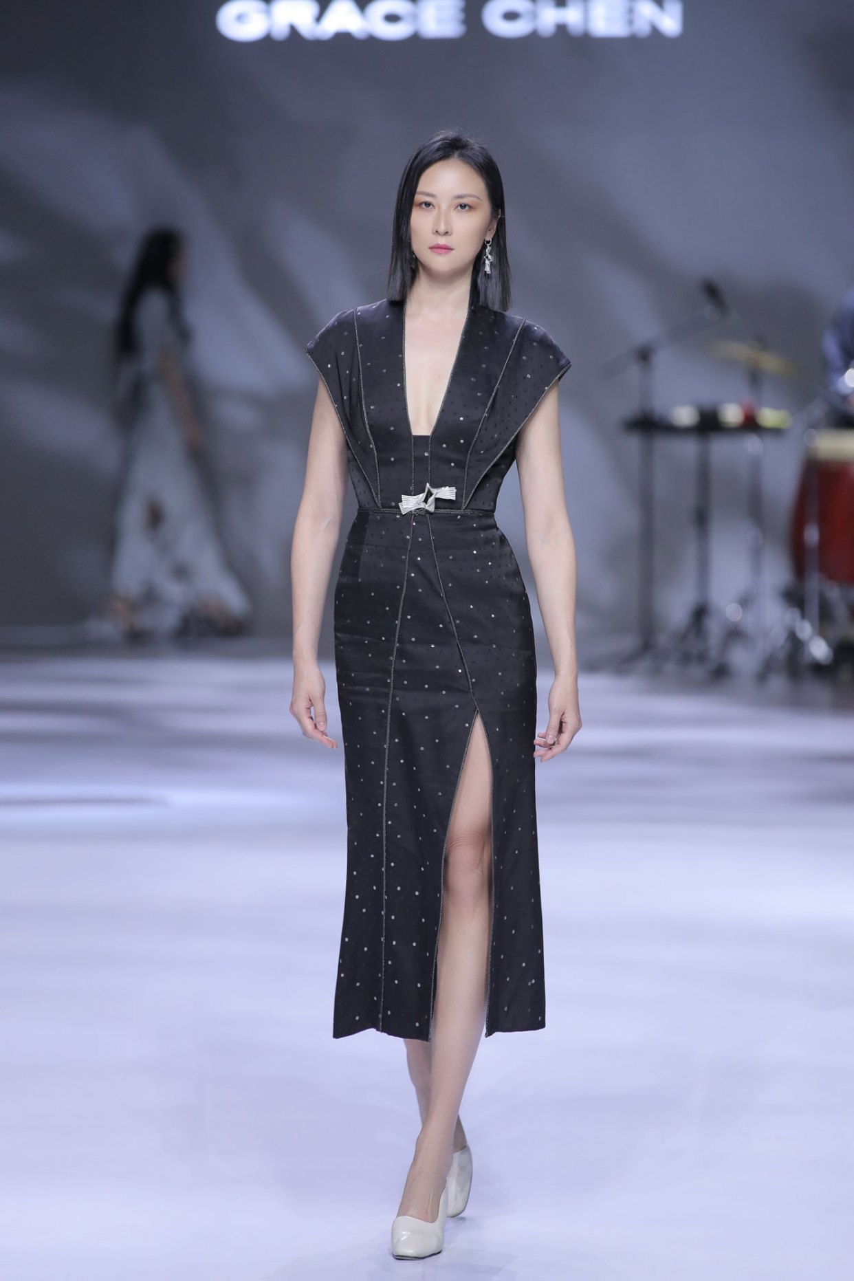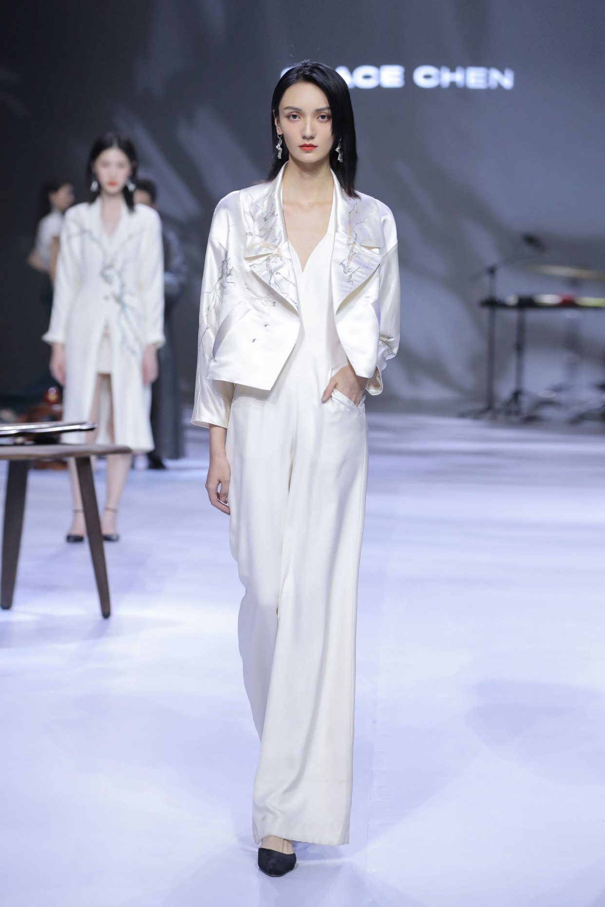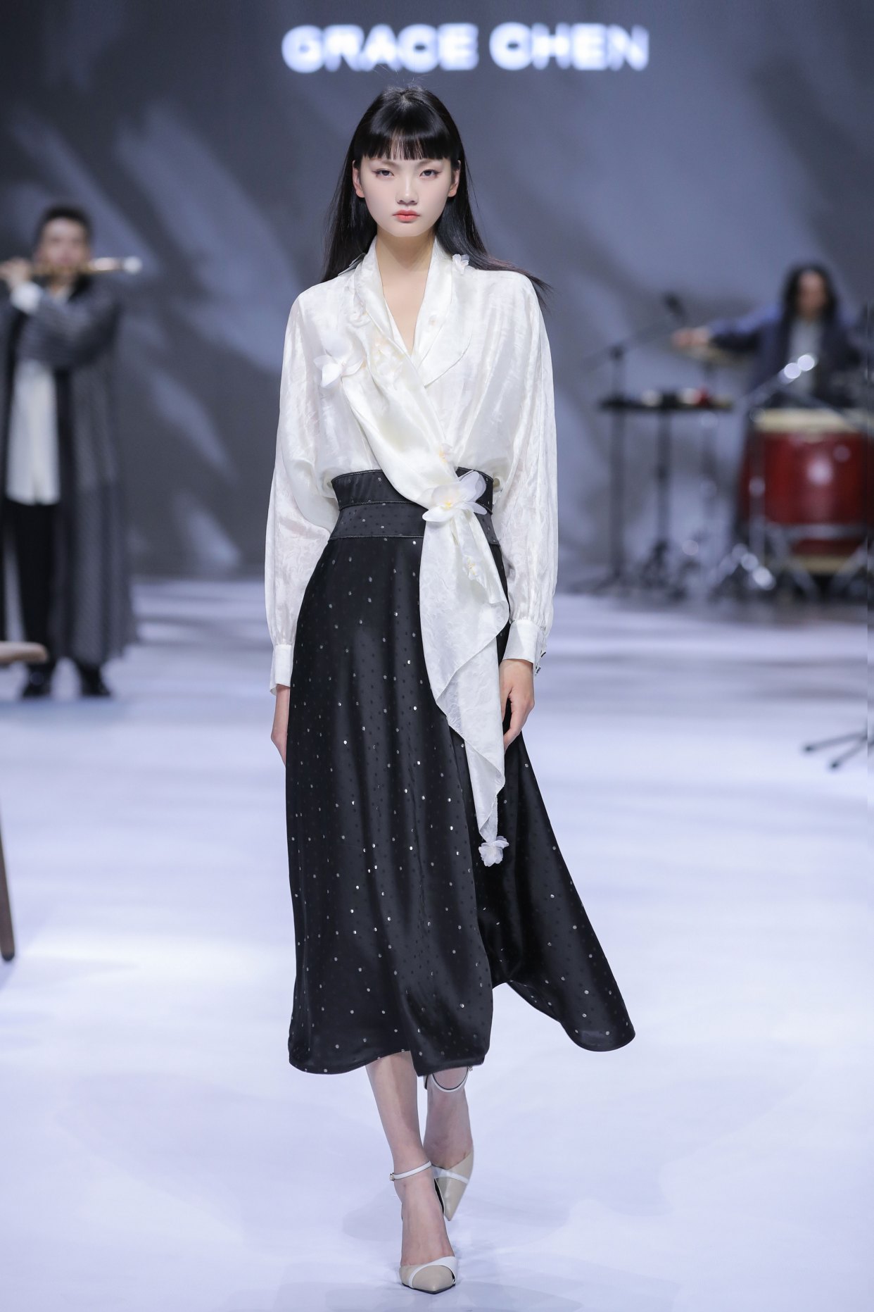 没有元素的堆砌、沉甸甸的刺绣,GRACECHEN大张“琴”鼓,在时装中融入“听觉语言”,将中国的山水、市井、园林等典型的文化意境抽象成为“普世美”,将中国女性的气质、比例、风骨、气质抽象成为“静深富”的时尚审美哲学,时装“动”人,在音乐的律动中“翩跹起舞”。