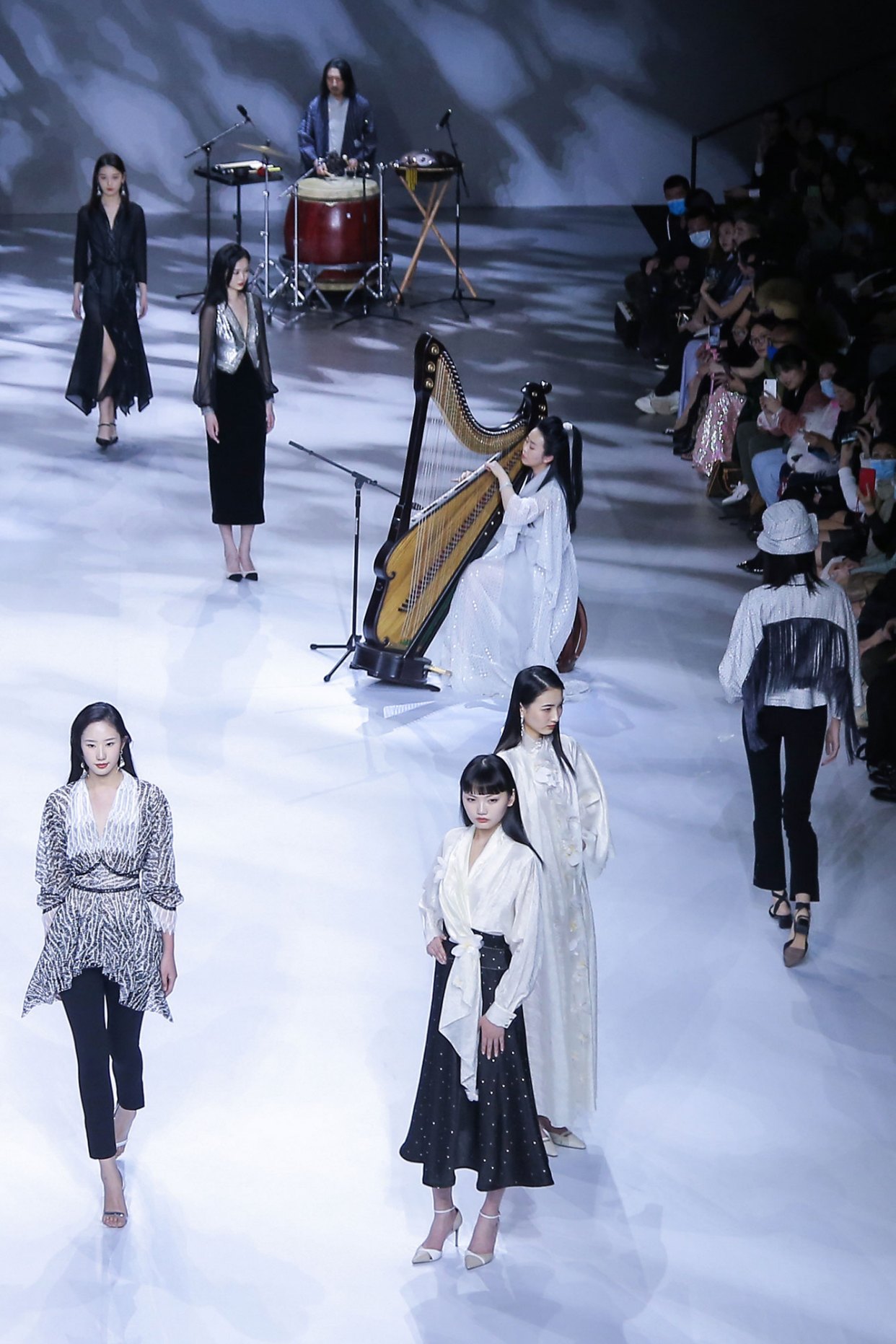 此次T台,不仅是一场时尚概念秀,更是一场专业的音乐盛会。设计师Grace Chen携手古琴演奏家路宁、笛箫演奏家丁晓逵、打击乐演奏家王佳男、箜篌演奏家吴琳,为嘉宾奉献了一场顶级的、充满了画面感和故事性音乐盛宴,用高雅的国乐诉说文化味十足的时装故事。
