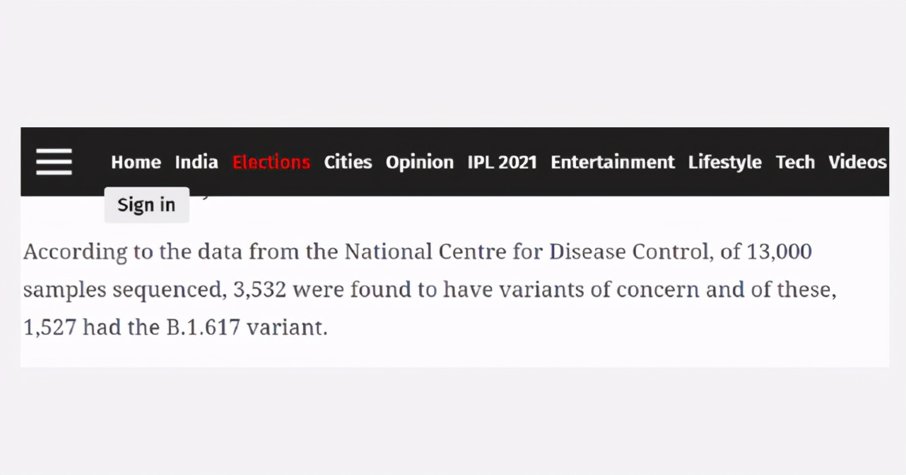 这段翻译成中文后其实是在说:根据印度国家疾病控制中心的数据,印度对1.3万个样本进行了基因测序,发现其中有3532个携带主要的新冠病毒变种毒株,这其中有1527个携带的是被印度发现的B.1.617这种双重突变毒株。