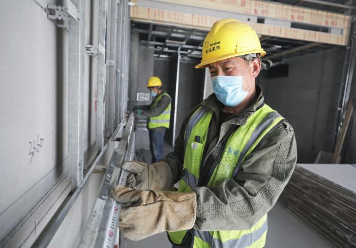5月17日,工人在冬奥会非注册VIP接待中心工程现场进行装修施工。