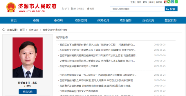 上述官方消息显示,济源市委副书记、市长石迎军已任河南省煤田地质局党委书记。
