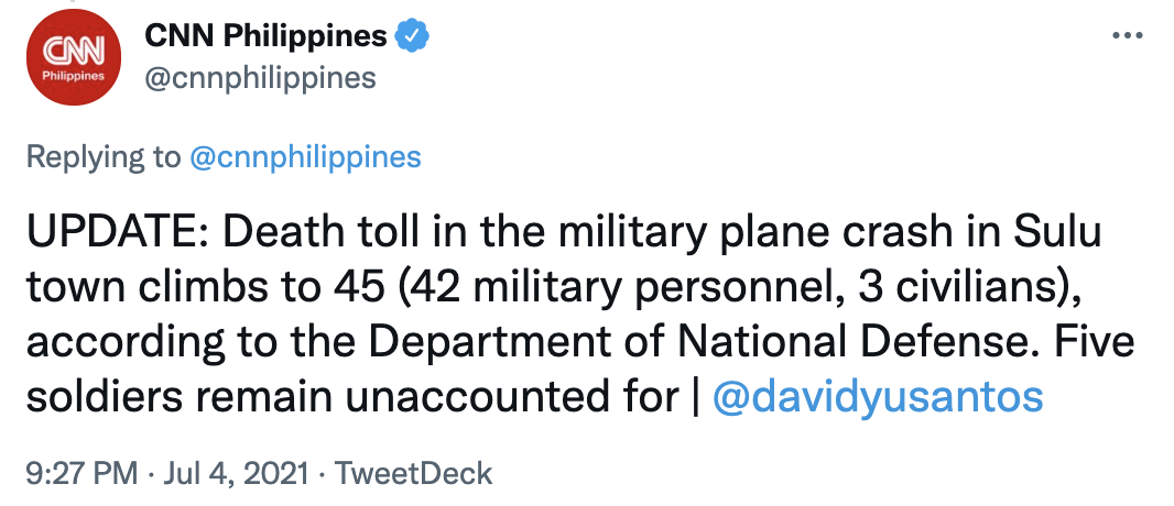 当地时间7月4日上午,菲律宾军方一架C-130运输机在苏禄省帕提库尔镇附近坠毁。据美国有线电视新闻网(CNN)援引菲国防部消息报道,事故已造成45人死亡,包括42名军人和3名平民,另有5名军人下落不明。