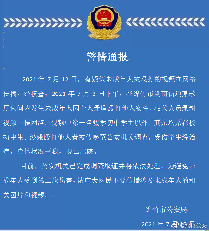 据四川@绵竹公安 7月13日凌晨通报,7月12日,有疑似未成年人被殴打的视频在网络传播。经核查,2021年7月3日下午,在绵竹市剑南街道某歌厅包间内发生未成年人因个人矛盾殴打他人案件,相关人员录制视频上传网络。视频中除一名辍学初中学生以外,其余均系在校初中生。涉嫌殴打他人者被传唤至公安机关调查,受伤学生经治疗,身体状况平稳,现已出院。目前,公安机关已完成调查取证并将依法处理。