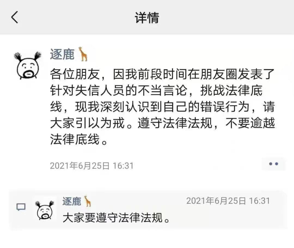 “有因为负债和经济问题不能坐飞机和火车的......出行问题我来给你解决。”“各位朋友,因我前段时间在朋友圈发表了针对失信人员的不当言论,挑战法律底线,现我深刻认识到自己的错误行为。”