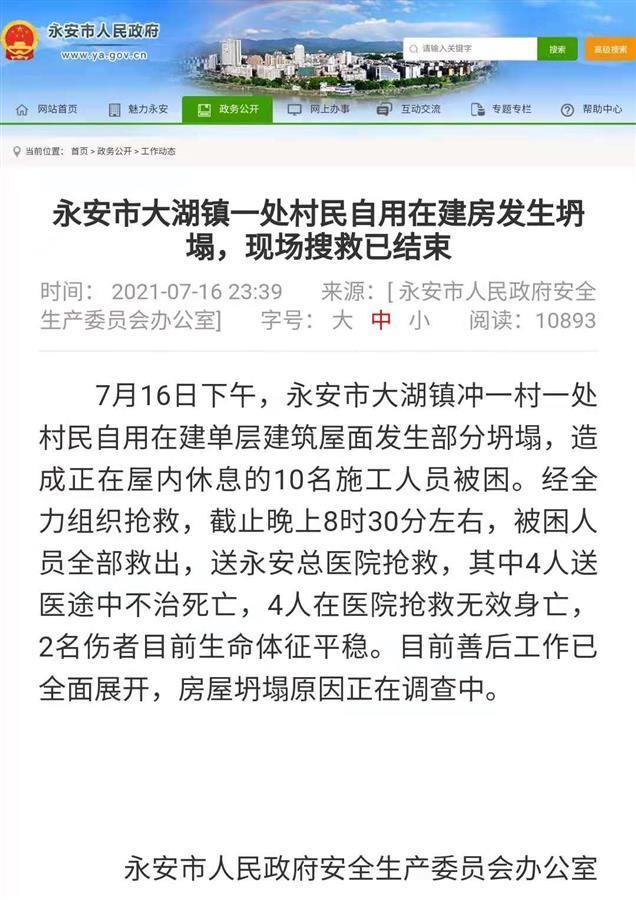 永安市政府消息通报称,7月16日下午,永安市大湖镇冲一村一处村民自用在建单层建筑屋面发生部分坍塌,造成正在屋内休息的10名施工人员被困。经全力组织抢救,截止晚上8时30分左右,被困人员全部救出,送永安总医院抢救,其中4人送医途中不治死亡,4人在医院抢救无效身亡,2名伤者目前生命体征平稳。目前善后工作已全面展开,房屋坍塌原因正在调查中。