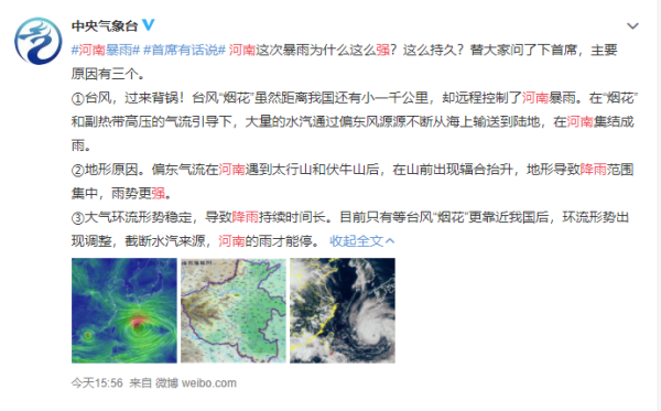 据中央气象台微博消息,河南这次暴雨为什么这么强?这么持久?替大家问了下首席,主要原因有三个。