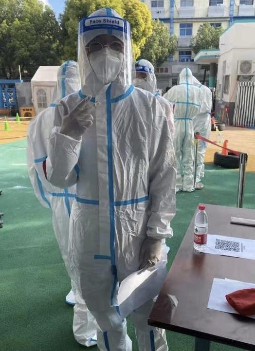 杨润杰:我穿防护服基本上就是过个十几分钟二十分钟就是一身汗,前天中暑过一次。当时是我们在做上门的核酸检测,刚好我们负责的那条街都是沿街商户,基本上都是在街上走,那天太阳比较大,我也没及时喝水,后来就中暑晕了。当时是到医院里面治疗,当天下午出院,第二天就正常上班了。确实一般喝水喝得少,因为喝多的话有上卫生间的问题,而且喝水多的话出汗更多,会更加不舒服。