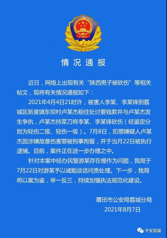 据“平安荔城”微信公众号消息,近日,网络上出现有关“陕西男子被砍伤”等相关帖文,现将有关情况通报如下: