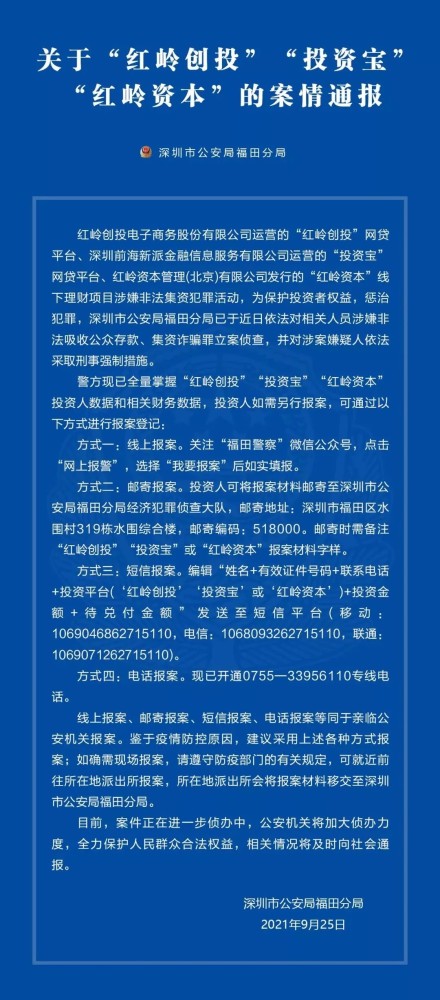 9月25日,深圳福田警方通报“红岭创投”“投资宝”“红岭资本”涉嫌非法集资犯罪的相关案情。目前,相关涉案人员已被警方采取刑事强制措施。