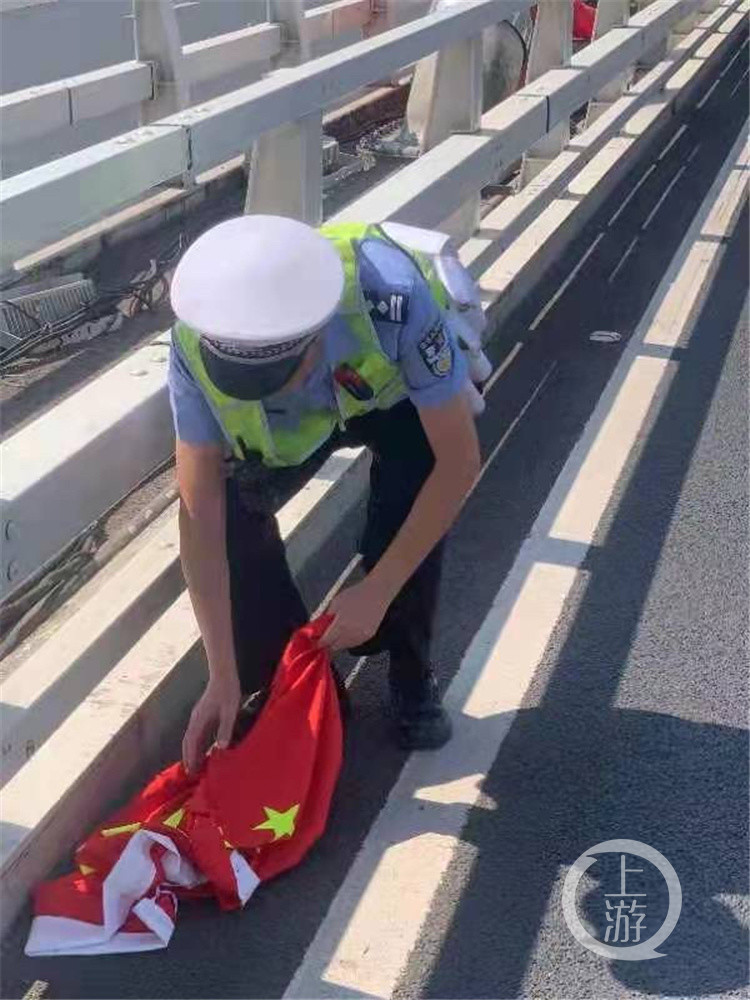 桥上过往的司机们为避免碾压、污损国旗,都主动绕行避让,但这也给车辆通行带来了一定的安全隐患。民警跑上前,弯着腰从护栏中小心拉出被卡住的国旗,用手仔细擦干净灰尘,再将国旗逐一折叠放好。“我们共在桥上拾到5面掉落的国旗,随后安排交付给相关部门做进一步处理。”廖军说。