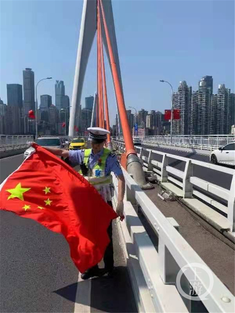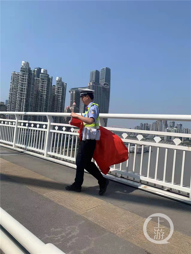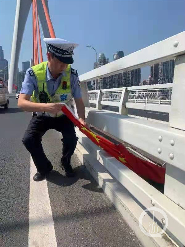 “当时东水门大桥中段江风很大,有国旗从灯杆上被吹落,掉在了桥面车行道和人行道上。”渝中区交巡警支队朝天门大队副大队长廖军带领执勤民警在附近巡逻时发现了情况,同时也接到多名群众反映。