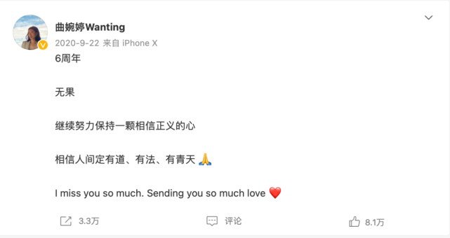 2020年9月22日,曲婉婷在微博发布了一条消息: