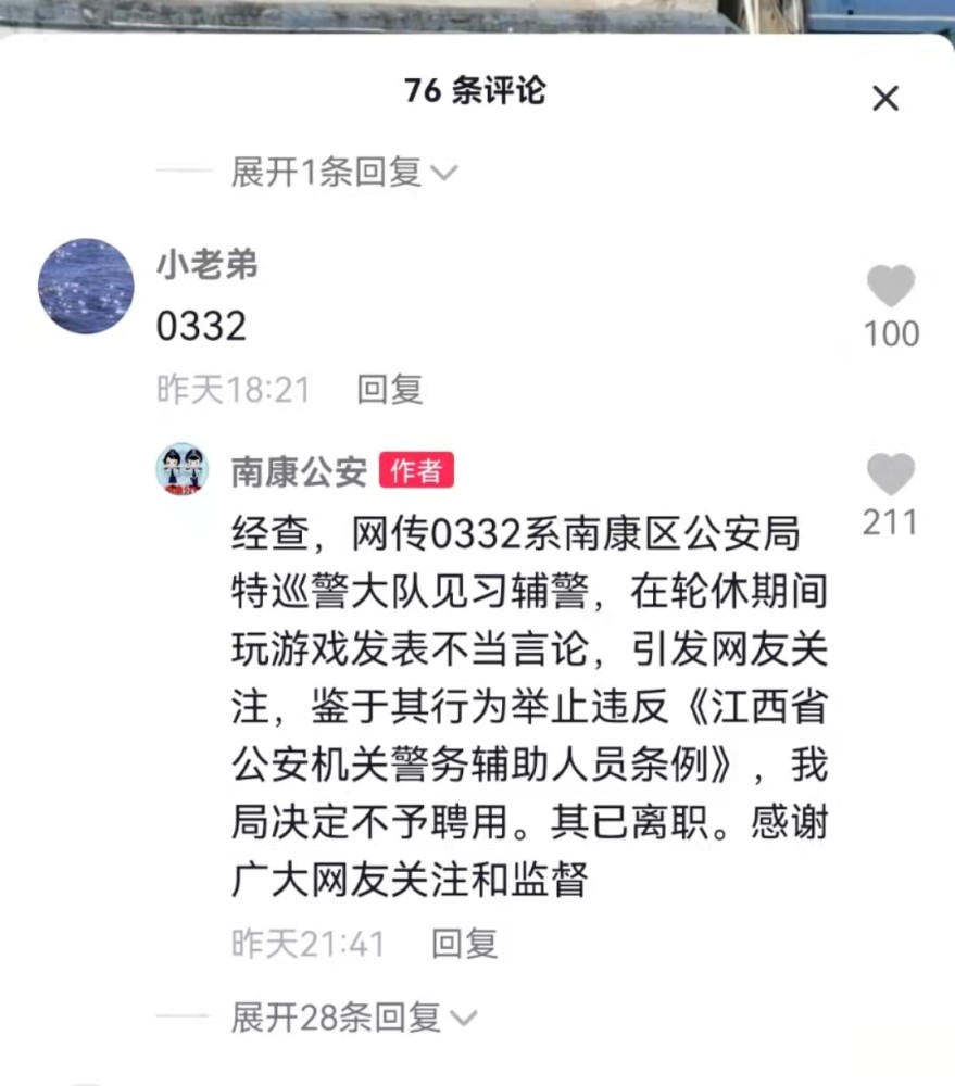 南康公安11月25日晚通过官方抖音账号发信息称:经查,网传的“0332”系南康区公安局特巡警大队见习辅警,在轮休期间玩游戏发表不当言论,引发网友关注,鉴于其行为举止违反《江西省公安机关警务辅助人员条例》,我局决定不予聘用。其已离职。
