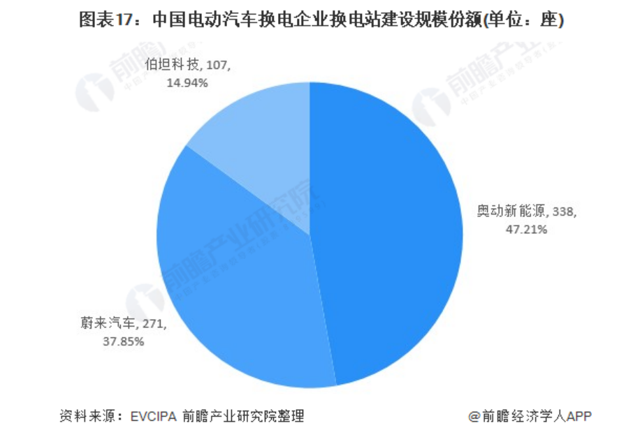 蔚来主打的还是换电站。根据EVCIPA统计的数据,国内换电站目前呈三足鼎立之势,奥动新能源、蔚来和伯坦科技占据了几乎全部市场份额。其中,奥动新能源以超过47%的市占率占据榜首,蔚来37.85%居于次席。