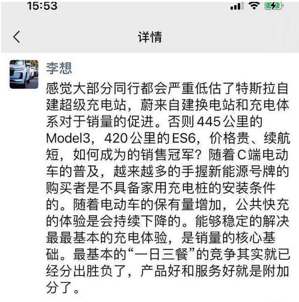 “感觉大部分同行都严重低估了特斯拉自建超级充电站、蔚来自建换电站和充电体系对销量的促进。能够稳定解决最最基本的充电体验,是销量的核心基础。”