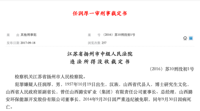 在他死亡3年之后,2017年7月,扬州市中院就扬州市人民检察院没收任润厚受贿、贪污、巨额财产来源不明违法所得没收申请一案公开宣判。