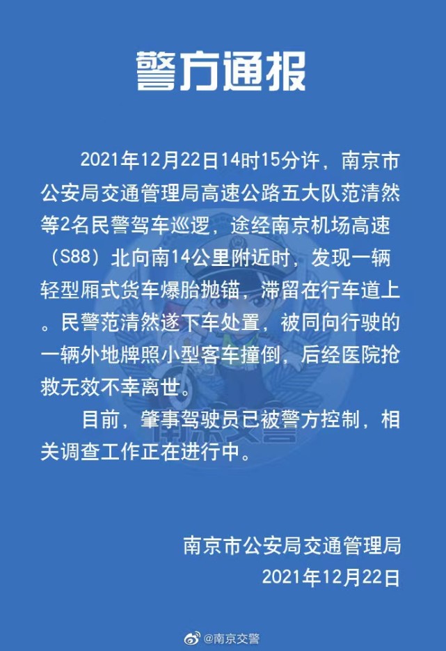 南京市公安局交通管理局2021年12月22日通报称,当日14时15分许,南京市公安局交通管理局高速公路五大队范清然等2名民警驾车巡逻,途经南京机场高速(S88)北向南14公里附近时,发现一辆轻型厢式货车爆胎抛锚,滞留在行车道上民警范清然遂下车处置,被同向行驶的一辆外地牌照小型客车撞倒,后经医院抢救无效不幸离世。
