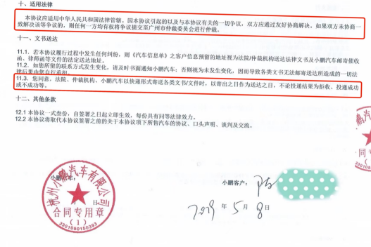 据一位广州车主提供的2021年10月份与小鹏汽车签订的,以及一份北京车主提供的2021年12月份与小鹏汽车签订的合同均显示,在“适用法律”这一条款上,写着“本协议应适用中华人民共和国法律管辖。因本协议引起的以及与本协议有关的一切争议,双方应通过友好协商解决。如果双方未协商一致解决该等争议的,则任何一方均有权将争议提交至广州仲裁委员会进行仲裁,仲裁语言为中文。仲裁裁决是终局的,对双方均有约束力。”在“文书送达”的细则上,写着“您同意,法院、仲裁机构、小鹏汽车以快递形式寄送各类文书/文件时,如您无故拒收视为已送达。”
