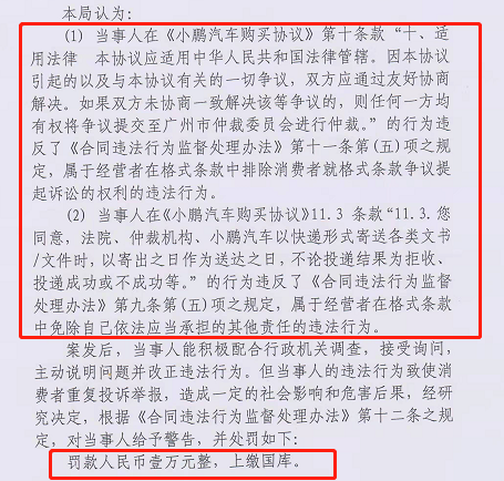 杭州市拱墅区市场监督管理局表示,经查明,2018年8月23日至2019年9月19日,当事人杭州小鹏汽车有限公司使用未备案《小鹏汽车购买协议》销售小鹏汽车G3,该购买协议共12条款,都以固定格式预先拟定并重复使用,其中在第十条、11.3条款没有采取合理的方式提醒消费者注意事项和赋予消费者对条款内容予以说明的情形。