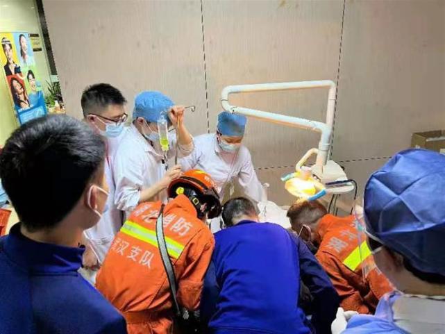 不到10分钟,泌尿外科罗鹏医生和消防队员先后紧急赶到。罗鹏在急诊外科医生协助下,为这名男子进行放血疗法+绷带缠绕法,减轻局部水肿,将塑料环向前移动了约0.5厘米。别看这小小的移动距离,为后面的切割异物赢得了宝贵的空间。由于塑料环卡得过紧,无法使用钢锯、液压剪等工具,消防队员一筹莫展。在场医护和消防队长紧急商议,最终一致决定,采用牙钻磨断塑料环的方式试一试。口腔科主任方飞听闻此事,带上相关器械飞速赶到。