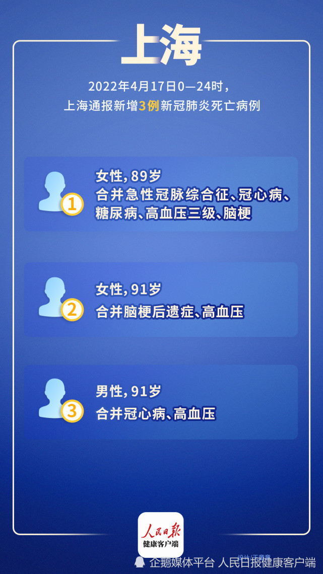 4月18日,上海通报新增3例新冠肺炎死亡病例,这也是此轮疫情中上海首次报告死亡病例。记者发现,3例死亡病例均为高龄,年龄分别为89岁、91岁、91岁,且合并有冠心病、高血压、脑梗等基础疾病。