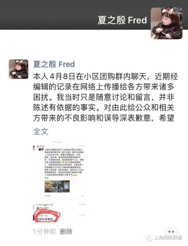 经上海辟谣平台了解并经市政协验证,上海并无政协家属楼,此传言所发物资也和政协无关。目前,发帖人“夏之殷Fred”也在相关微信群和朋友圈作澄清说明:本人4月8日在小区团购群内聊天,近期经编辑的记录在网络上传播给各方带来诸多困扰。我当时只是随意讨论和留言,并非陈述有依据的事实。对由此给公众和相关方带来的不良影响和误导深表歉意,希望各位不要再转发占用宝贵的公共传媒资源,特此声明。