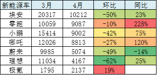 相比之下,传统车企中的“新势力”在销量上表现分化明显。表现最抢眼的依然是埃安,虽然4月份销量环比下降50%,但仍然达到10,212辆,也是上月销量能破万的唯一一家。