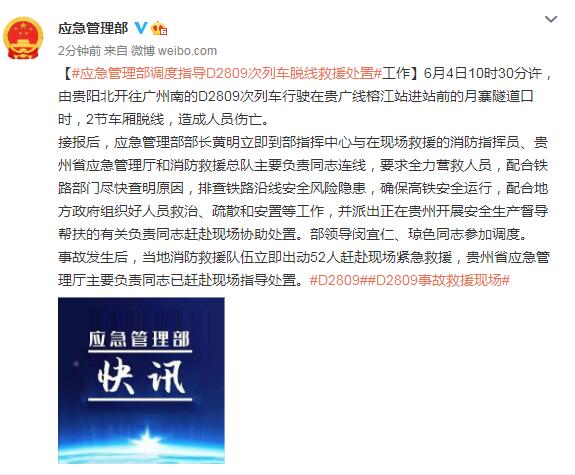 4日10时30分许,由贵阳北开往广州南的D2809次列车行驶在贵广线榕江站进站前的月寨隧道口时,2节车厢脱线,造成人员伤亡。