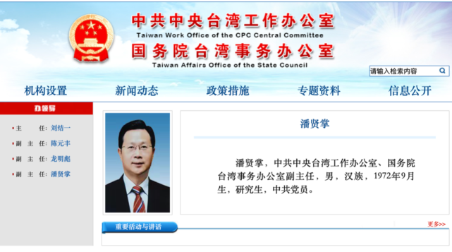 8月11日,政知君从中共中央台湾工作办公室、国务院台湾事务办公室网站获悉,潘贤掌已任中共中央台湾工作办公室、国务院台湾事务办公室副主任。