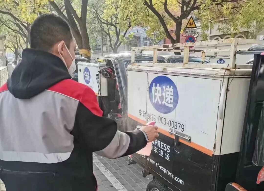 初冬的清晨寒气未消,6点天还未亮,东直门街道顺丰速运东方银座业务部里的快递小哥们早已开始了忙碌,为接下来的配送做着准备。快递小哥曹利民将负责范围的快递整理好装车,7点左右启程出发,开始了一天的配送。