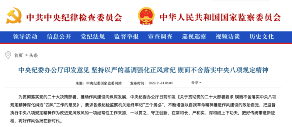 在这之前,11月14日,中央纪委办公厅印发《关于贯彻党的二十大部署要求 锲而不舍落实中央八项规定精神深化纠治“四风”工作的意见》。这份《意见》是党的二十大之后,中央纪委首次明确发文,对落实中央八项规定精神做出部署。