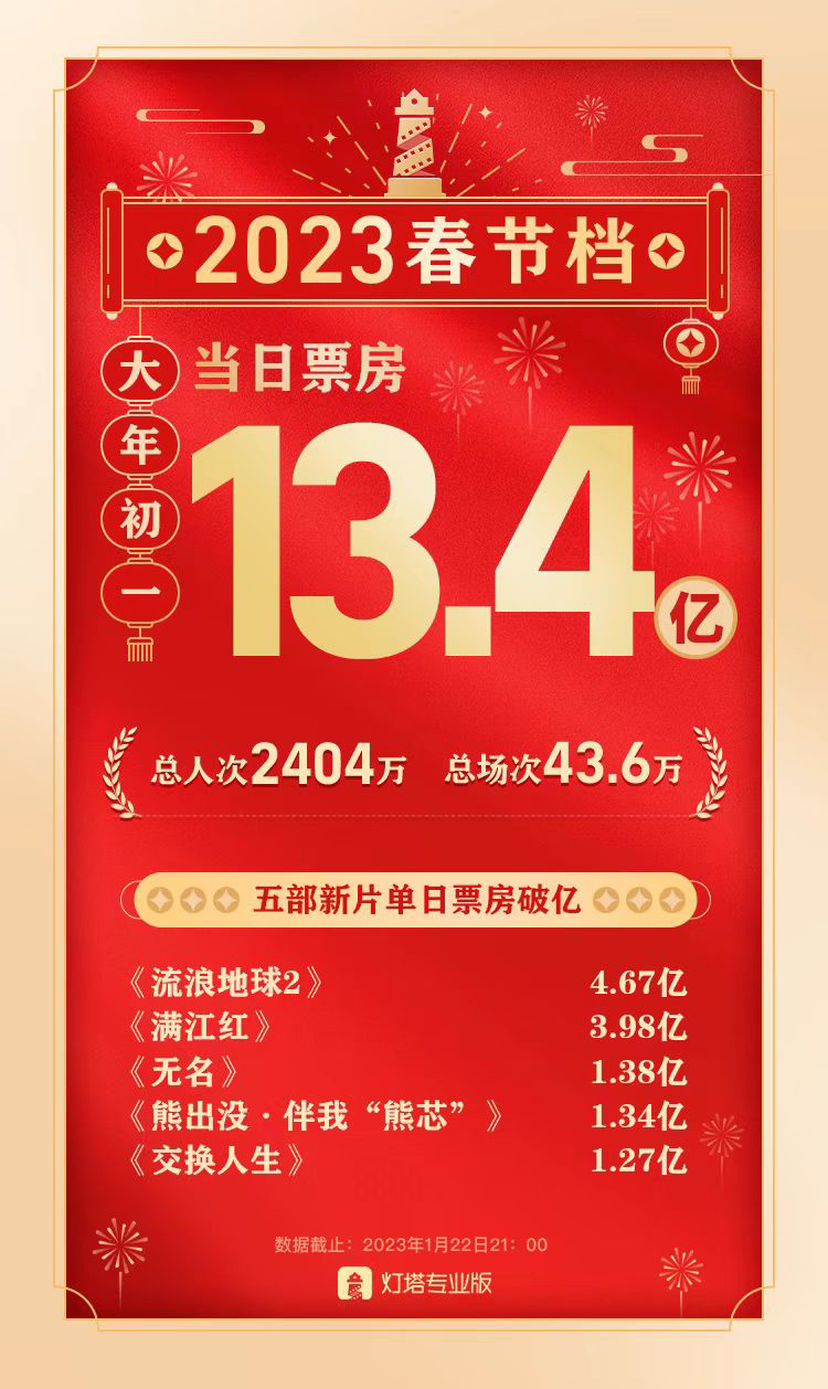昨天(22日),春节档新片闪亮登场,据灯塔专业版官方数据,首日总票房达13.4亿,总人次2404万,总场次43.6万,值得一提的是,五部新片的首日票房均破亿。同时,《流浪地球2》《满江红》《无名》《交换人生》《深海》《熊出没·伴我“熊芯”》等六部新片的口碑也陆续出炉。