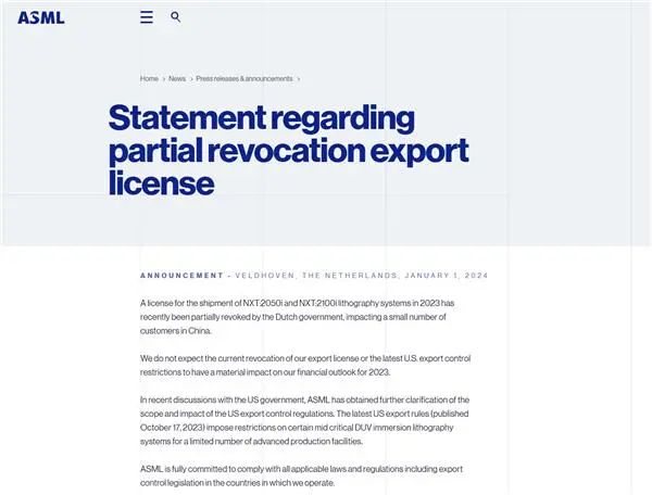 1月2日上午,证券时报记者从ASML获得的官方声明显示,荷兰政府部分撤销的是此前颁发的NXT:2050i和NXT:2100i光刻机在2023年发货的出口许可证。