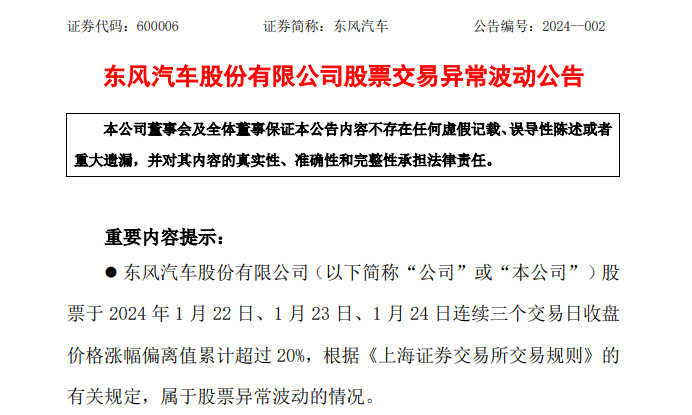 1月24日晚,东风汽车公告,公司股票于2024年1月22日、1月23日、1月24日连续三个交易日收盘价格涨幅偏离值累计超过20%,属于股票异常波动情况,经公司自查并向控股股东东风汽车集团股份有限公司发函询证,截至公告披露日,不存在应披露而未披露的重大信息。