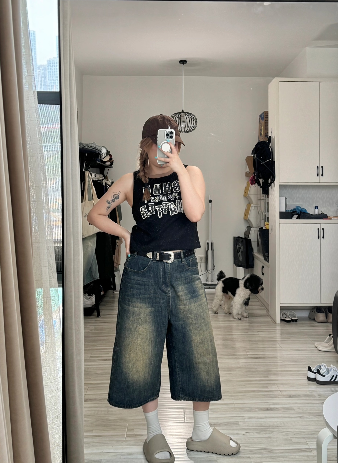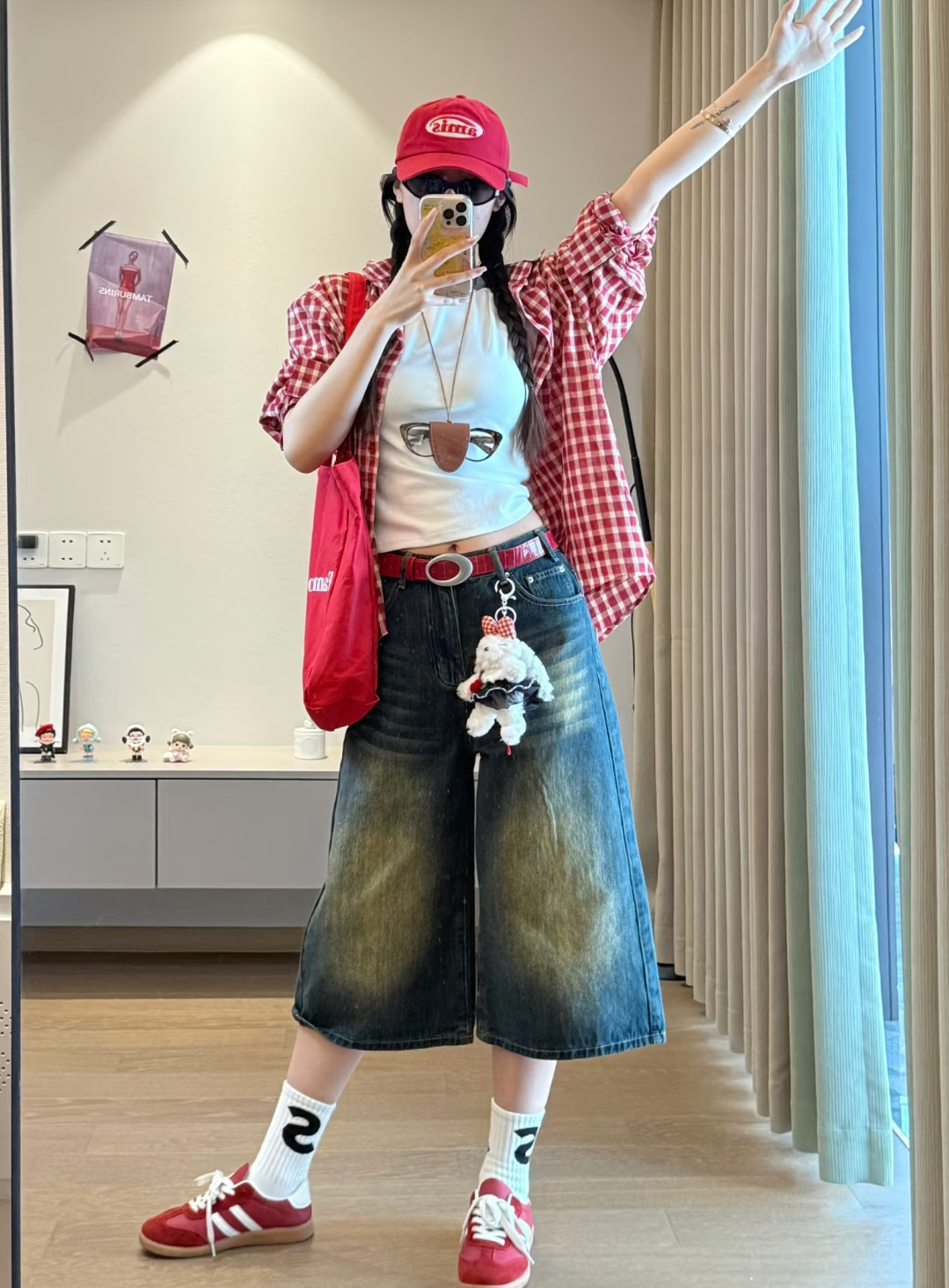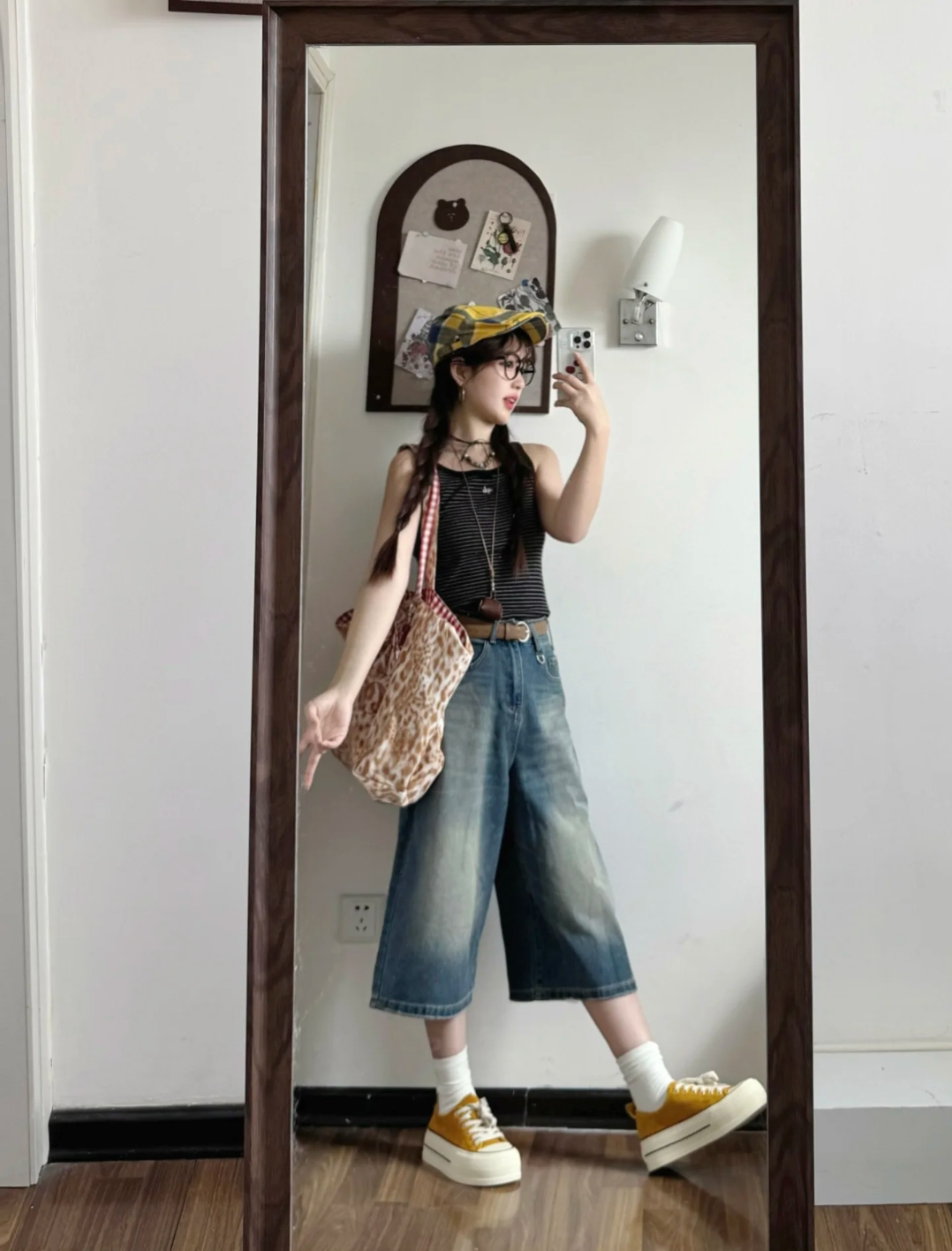 小个子女生穿中裤可以选择更长一点的八分裤,上衣选择短款crop top 或将普通 T 恤扎出 “衣角结”,进一步强调腰线。配饰上细腰带、前进帽等窄檐帽的小面积单品能起到纵向拉伸作用,让整体造型更显挺拔。