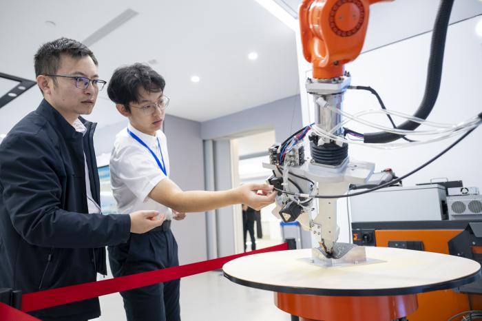 11月6日,在武汉产业创新发展研究院,工作人员展示增材制造机器人。新华社记者 伍志尊 摄