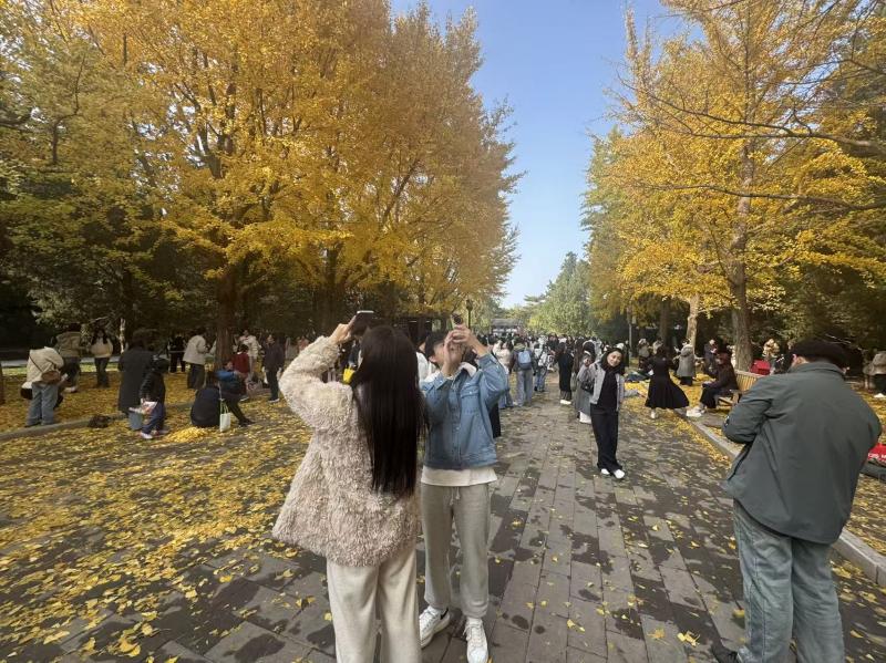 在地坛公园西门外,两侧金黄的银杏树成排而立,枝叶交错成拱,铺出约300米“黄金隧道”。秋风一过,银杏叶簌簌飘落,像下了一场“金雨”。落叶踩上去“咔哧咔哧”直响。数百位游客目不暇接,在树下拍照、捡叶子,走走停停。