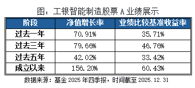 注:工银智能制造股票A成立于2017年6月21日,李劭钊自2022年10月14日起开始管理。该基金2021-2025年各年度净值增长率分别为15.69%、-31.67%、-16.20%、25.44%、70.91%;同期业绩比较基准收益率分别为9.53%、-17.00%、-9.03%、18.87%、35.71%,基金净值增长率及基准收益率来自基金定期报告。