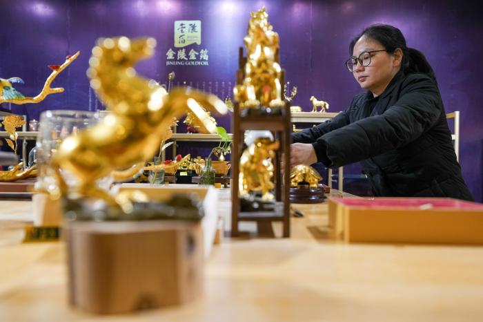 在南京金陵金箔集团股份有限公司,工作人员在展销中心整理生肖马年金箔产品(2月9日摄)。